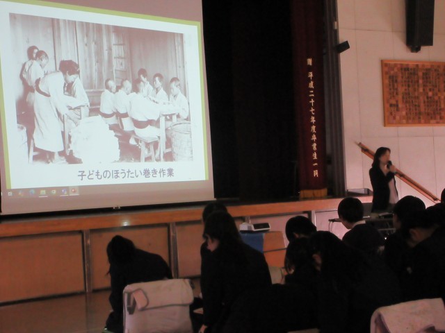 1月29日には、国立ハンセン病資料館の主任学芸員に方に、2時間にわたってお話をしていただきました。ハンセン病とはどんな病気なのか、療養所とは名ばかりで隔離された中でどのように生活していたのか、差別の歴史、ハンセン病元患者の方が残そうとした思いなど、資料や写真も交えてわかりやすくお話してくださいました。子供たちもとても熱心に聞いていて、暗い中でしたが心に残ったことをノートに記録しており、講師の先生も感心されていました。中には3ページ、4ページとメモをした子もいます。子の学びを基に、ハンセン病について調べ学習をするとともに、偏見や差別について考えていきます。