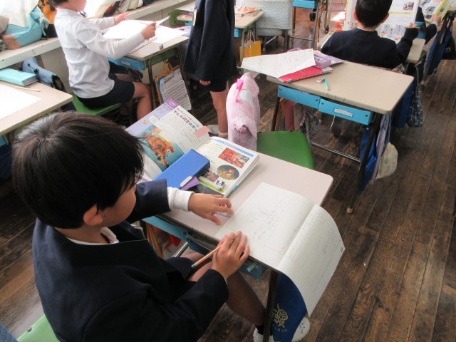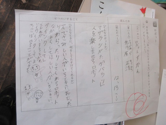 たくさんの本の中から自分の好きなロボットを見つけて、その紹介をします。カツオの一本釣りロボット、お話し相手になるロボット、水の中を探索するロボット、自分のお気に入りのロボットについて文を書きます。ワークシートに本を見て調べたこと、分かったことを記入して、先生に見てもらいます。友達どうして見せ合う子もたくさんいました。