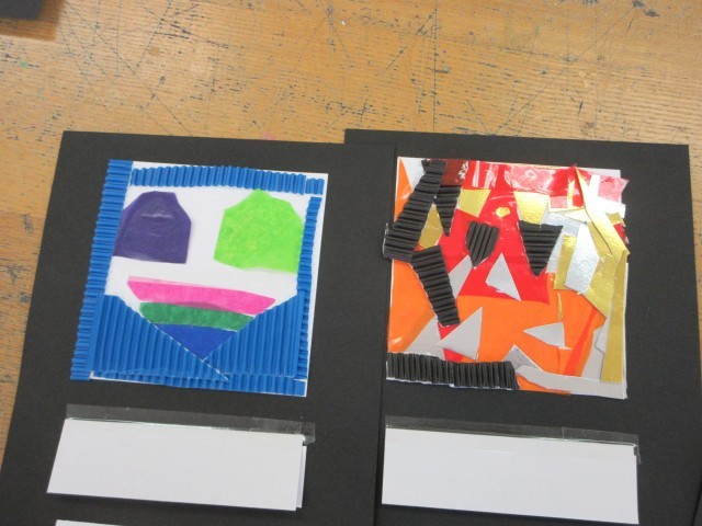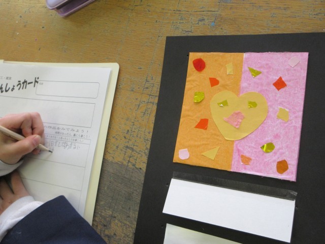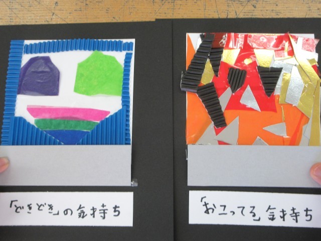 図工ではいろいろな心をカードに表す学習をしています。一辺10cmの厚紙に、様々ないろがみを貼って心の様子を表します。紙の色だけでなく、質も様々です。子供は自分の表したい心に合わせて、紙を選び、気持ちが伝わるように切って、台紙に張ります。優しい気持ちなら、暖色系の柔らかい紙を丸く切って貼るなど、自分で考えて攻勢を工夫して心を表します。