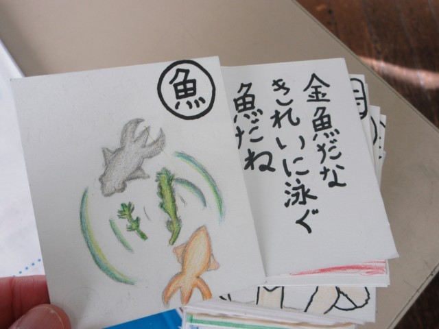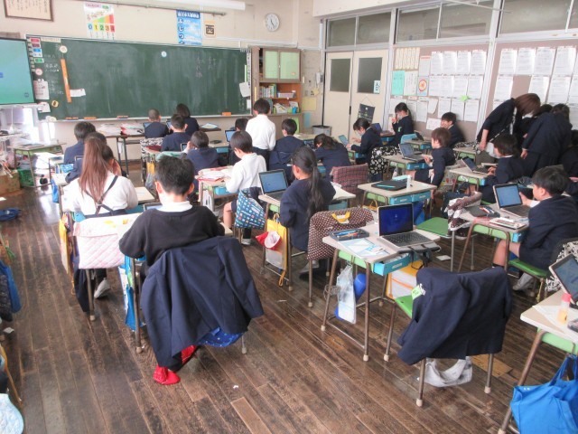 国語では音訓かるたづくりをしています。2月下旬に行われる地域の方との2回目のふれあい給食で一緒に楽しみたいと、取り組んでいます。目的があるのでみんな一所懸命に作っています。タブレットでイラストを参考にしながら、読み札と取り札を作っています。