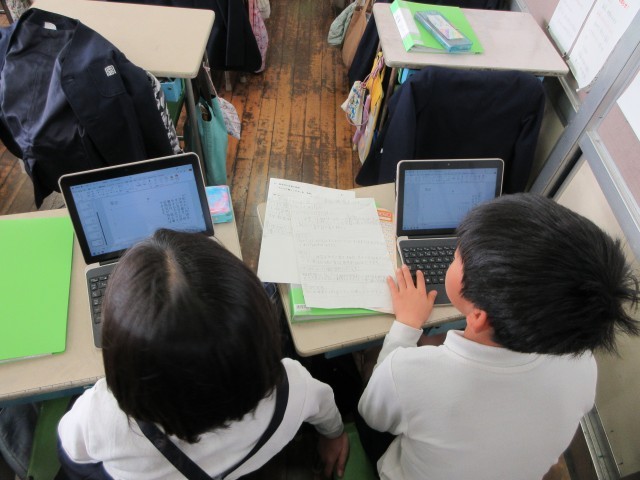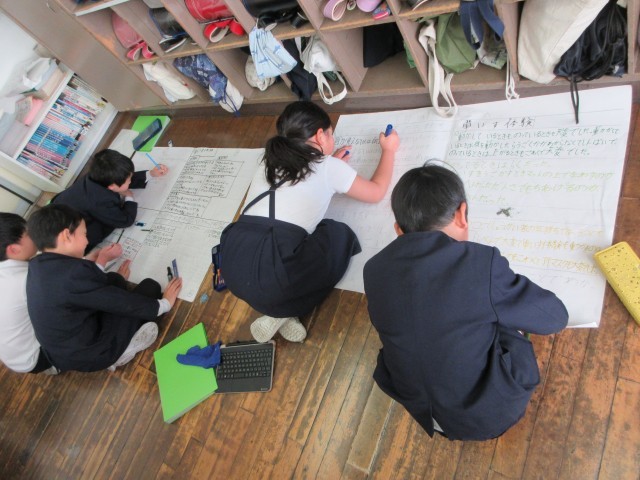 以前に紹介した障害者についてのまとめもそろそろ終わりに近づいています。模造紙に書いてまとめるグループ、タブレットにまとめるグループ、それぞれ仕上げに向かって協力しています。先生に言われるのではなく、自分たちで考えて進めているのがいいです。もうすぐ5年生、自主的に進める力も付いてきました。