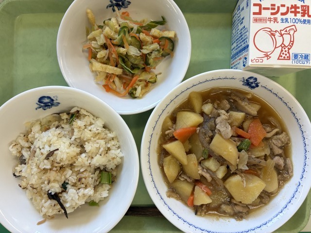 献立:牛乳、むろぶしご飯、肉じゃが、和風サラダ
