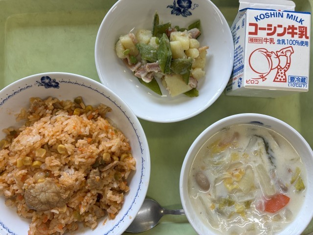 献立:牛乳、メキシカンピラフ、スナップエンドウのソテー、白菜のクリームスープ