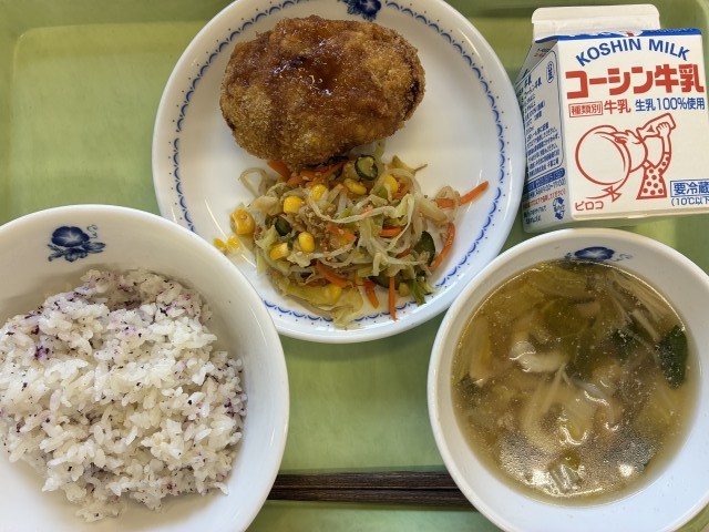 献立:牛乳、ゆかりご飯、かぼちゃコロッケ、色彩りサラダ、きりたんぽ汁