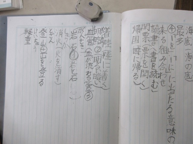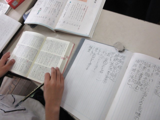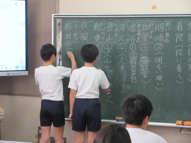 国語では2文字の熟語のつくりについて学習しています。『上下』は反対の意味の漢字でできた熟語、『黒板』は上の言葉が下の言葉を詳しく説明する熟語・・・それぞれの熟語がどんな作りでできているのかを辞典を使って調べていました。