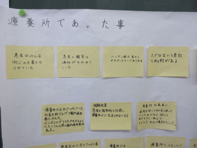 先日、ハンセン病資料館の方のお話を聞きました。国の誤った隔離政策で療養所とは名ばかりで病気にかかった方がとても苦しい生活をしていたこと、厳しい差別を受けていることなど、子供たちは「日本でこんなことが起きていたんだ。」と、驚きをもって聞いていました。