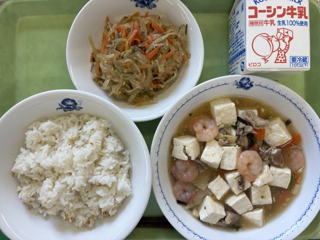 献立:牛乳、ごまご飯、三鮮豆腐、野菜と春雨の甘酢煮