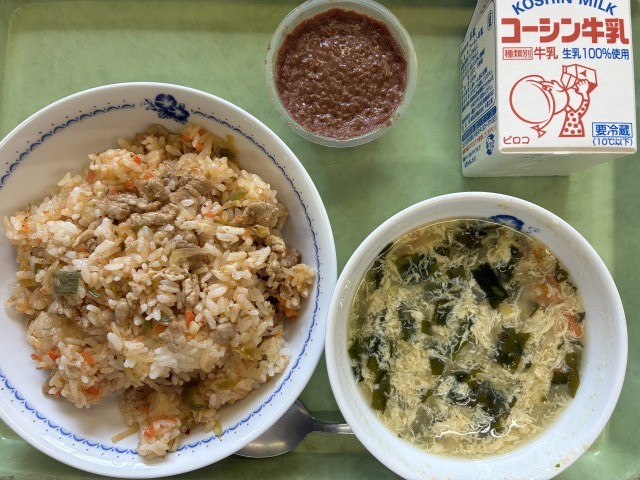 献立:牛乳、キムタクご飯、わかめと卵のスープ、チョコプリン