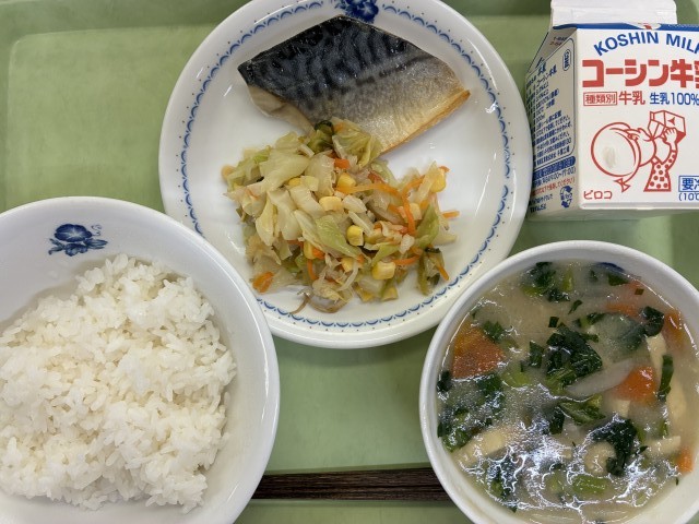 献立:牛乳、ご飯、さばの塩焼き、レモンサラダ、だご汁