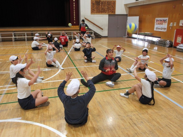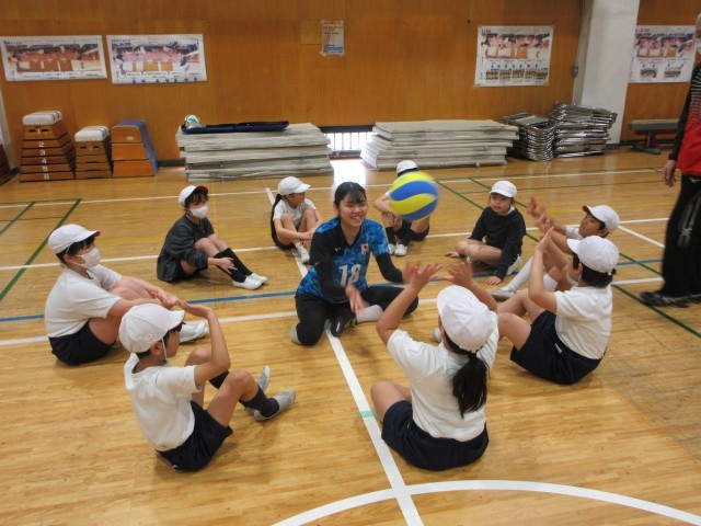 続いてトスやレシーブの練習をしました。最後に選手を中心にパスを回していきました。はじめはうまくいきませんでしたがだんだん上手にパスができるようになってきました。監督からは相手の名前を呼びながら、やさしくボールをつないでいくようにお話がありました。どのスポーツも仲間を思いやる優しい心が大切であることを教えてもらいました。