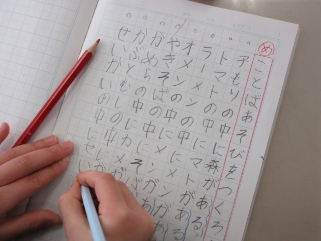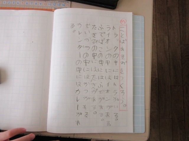 『みかんの中にはカンがある。』、『カメラの中にはかめがいる。』 のような例文から、言葉の中にある言葉を探してたくさんの文を作っていました。文字を書くのも速く、そしてていねいになってきました。学習する中で、生き物のときには『いる』、物のときには『ある』を使うことにも気付いていました。楽しみながら学んでいます。