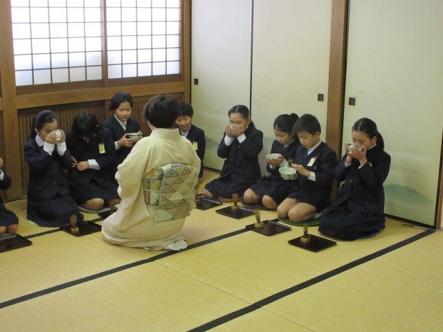 自分でたてたお茶を味わいました。少し苦いけれどおいしくいただきました。その後は、質問コーナーです。子供たちからはお茶のこと、茶道をしているときの気持ち等いろいろな質問が出ました。最後に総礼をして終わりました。いつもとは違った和の雰囲気を味わい、とてもよい経験になりました。