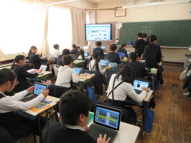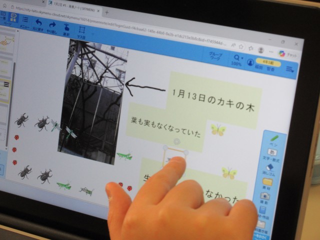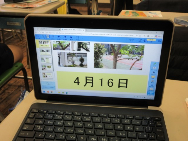 理科では、1年間に渡って生き物の変化を追っています。このときに活躍するのがタブレットです。4月から撮りためておいた校庭の木々の写真を比較して、変化の様子をまとめています。写真を見ると、植物の小さな変化もはっきりと見えてきます。もうすぐ5年生。タブレットも使いこなしていてまとめ方も上手になってきました。