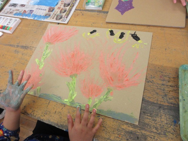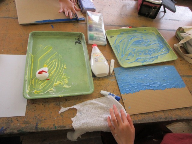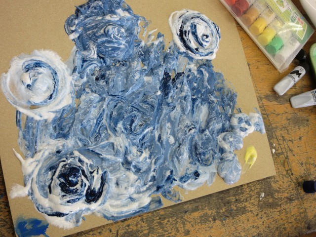 液体粘土は、白くて水気を含んでいてトロトロとした粘土です。粘土なので乾くと固まります。『図工の先生が小学校の間にこの素材を体験させたい!』と準備をしてくれました。はじめはその手触りに気持ち悪がっていたのですが(低学年だと大喜びです)、だんだんと慣れて来て、自分の表現したいものを描いていきました。絵の具で色を付けて絵にしたり、立体的になるよさを生かしてでこぼこを付けたり、それぞれが工夫して自分の思いを表現していました。