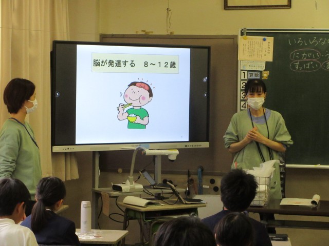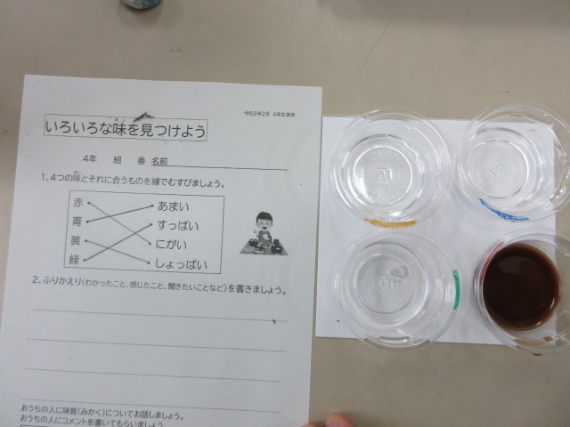 はじめに栄養士が、味には、あまい・すっぱい・しょっぱい・苦い の4つがあることを話しました。水でうすめた4つの味を飲んで、どの味かを当てる実験をしました。みんな真剣に味わっていました。次は養護教諭の出番です。味は味覚だけでなく、におい・触覚・視覚・聴覚 も使って感じ取っていること、味覚は8歳から12歳の間に大きく育つことなどを教えてもらいました。