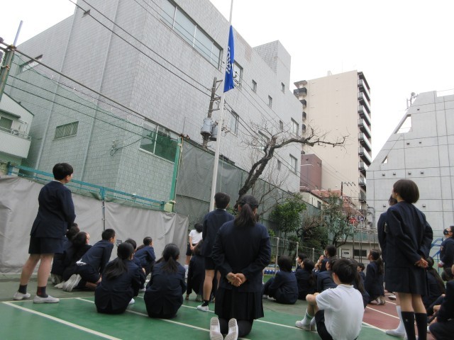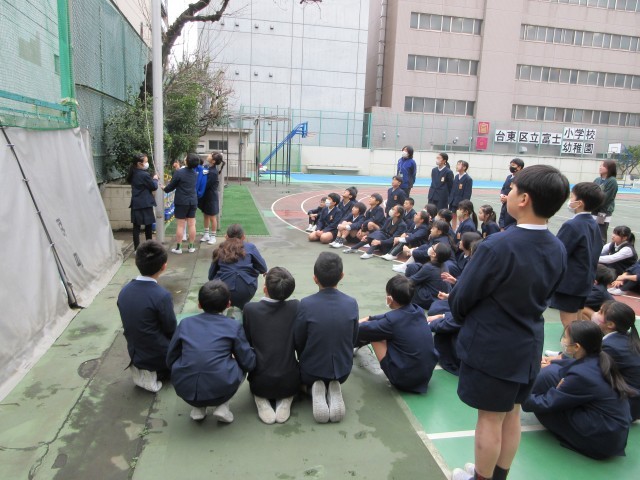 先週の6年生を送る会で、6年生から校旗を引き継いだ5年生が今週から校旗の揚げ下ろしをしています。校旗を揚げるにも細かな注意が必要で、今朝は6年生から教わった代表児童が5年生全員に正しい旗の揚げ方を教えました。みんな、『校旗を揚げる』という仕事の重さを感じていて、真剣に聞いていました。これから1年間、校旗を、そして富士小をお願いします。