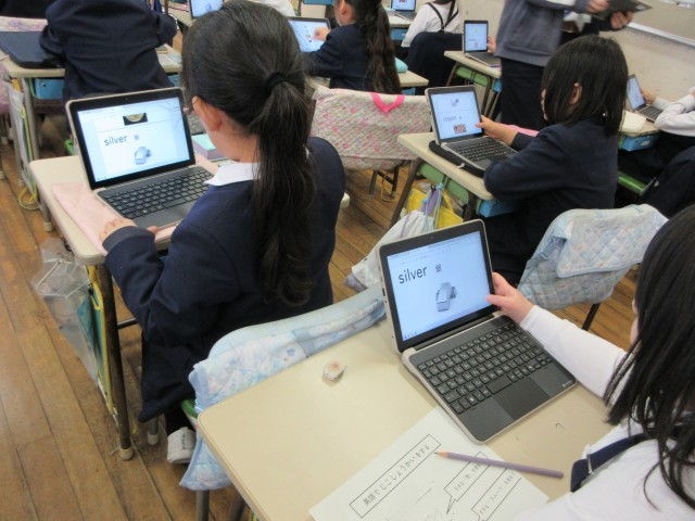 英語の先生が作ってくれた『色』や『くだもの』のスライドを基に、red、green、blue・・・やapple、peach・・・などいろいろな英語を知りました。みんなで大きな声で発音練習をしたあとに、タブレットで見ながら自分で英語を確かめていました。少しずつ英語の世界に慣れ、覚えていきます。