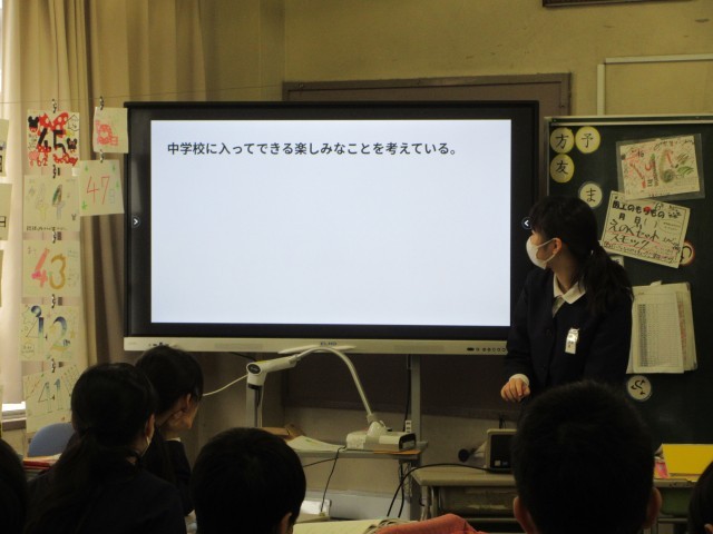 テーマは卒業を前に思うこと。将来の夢や中学校でやりたいこと、小学校生活で思い出に残ったこと・・・などです。相手に思いが伝わるように文章を工夫し、プレゼンも自分で考えました。