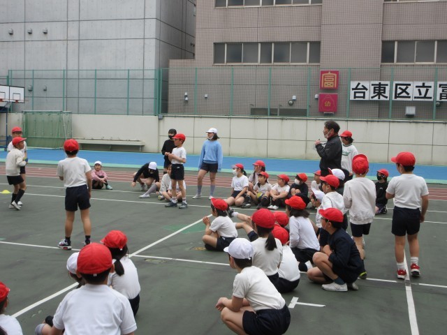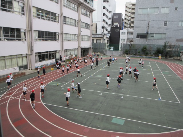 学年合同でラグビーの練習をしました。