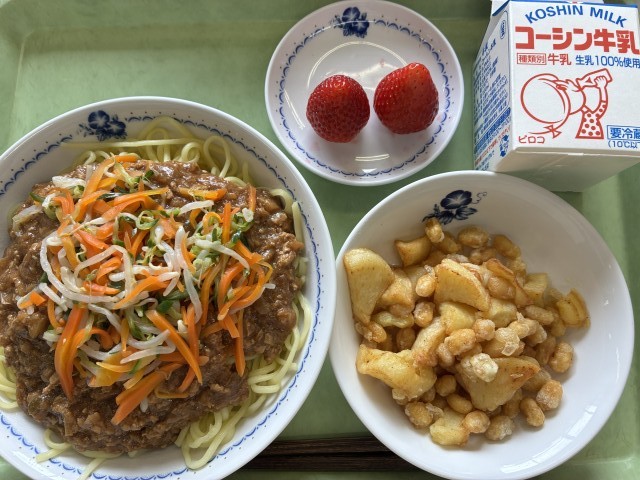 献立:牛乳、ジャージャー麺、スパイシーポテトビーンズ、いちご