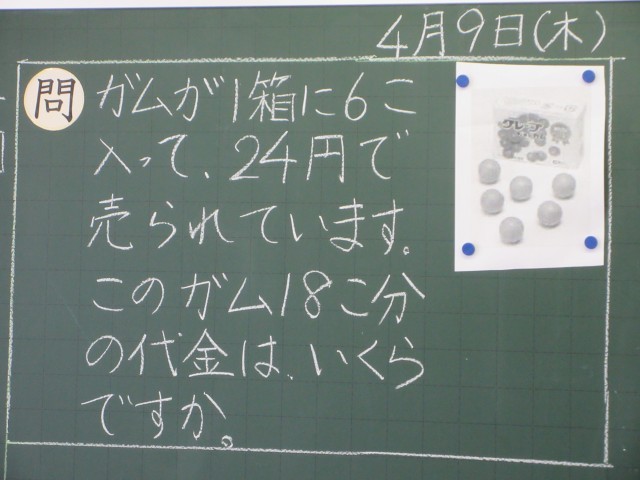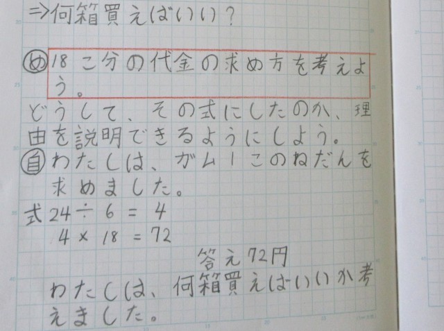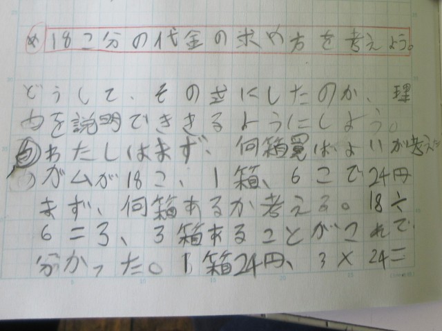 一番上の写真の問題を解いていきます。解き方はいろいろあります。真ん中の写真の子はガム1個あたりの値段を求めて解いています。下の写真の子は、何箱分あるかをもとに解いています。一人一人が自分で考える『自力解決』を大事にして、考える力、それを表現する力を育てています。また、今年度初めての授業で、算数少人数担当の先生がノートの取り方についてもていねいに指導していました。