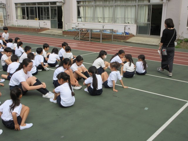 1年生の発育測定のお手伝いです。校庭で1年生とペアになって、それぞれが自己紹介をしました。その後、視力検査、身長・体重の測定など一緒にして回りました。待っている間には話をして、仲良しになりました。5年生、高学年としてがんばっていました。