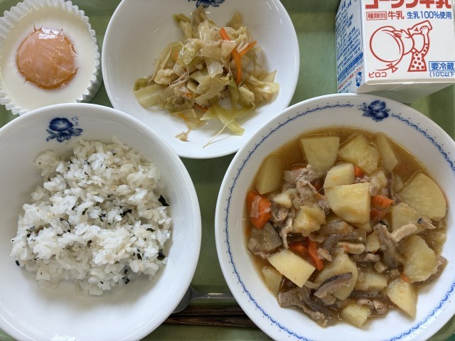 献立:牛乳、わかめご飯、肉じゃが、キャベツの辛子和え、ふしぎな目玉焼き