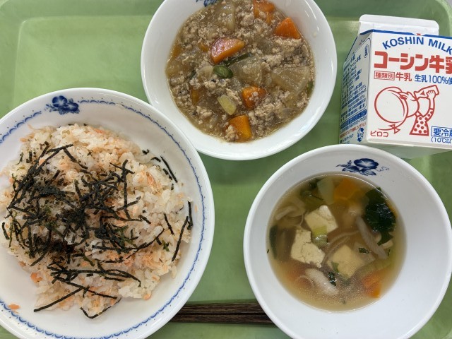 献立:牛乳、鮭寿司、大根のそぼろ煮、けんちん汁
