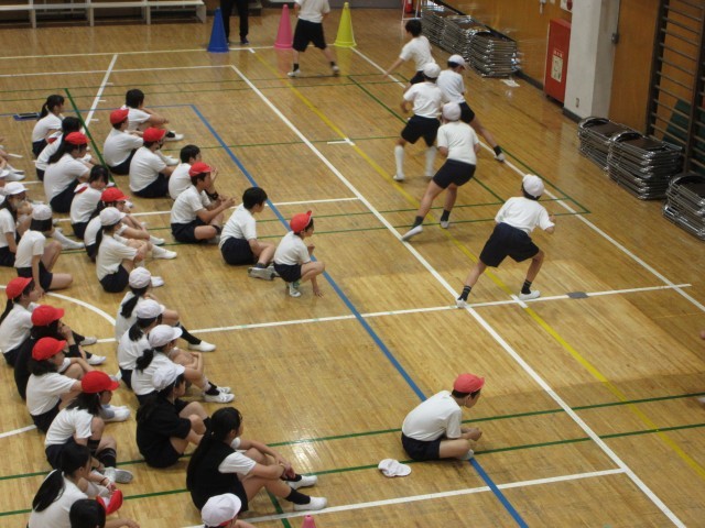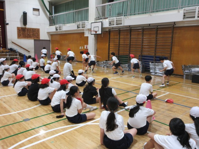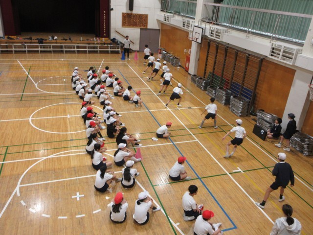 種目は反復横跳び。去年までの記録を上回るように一所懸命にチャレンジしていました。ペアの子が数を数えて、協力しながら、励ましながら学習しています。