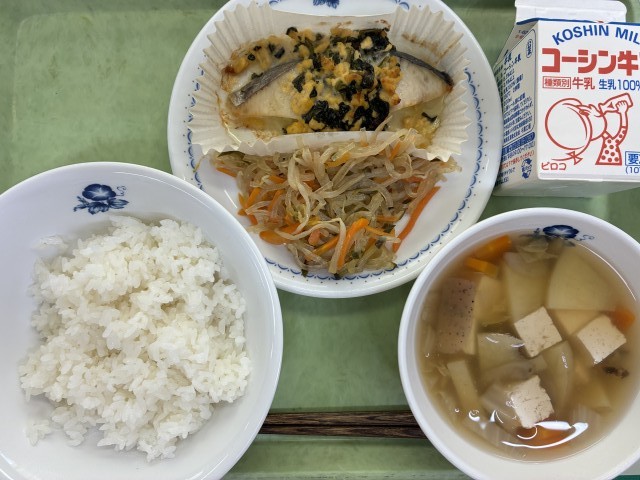 献立:牛乳、ご飯、魚の菜種焼き、野菜と春雨の甘酢煮、吉野汁
