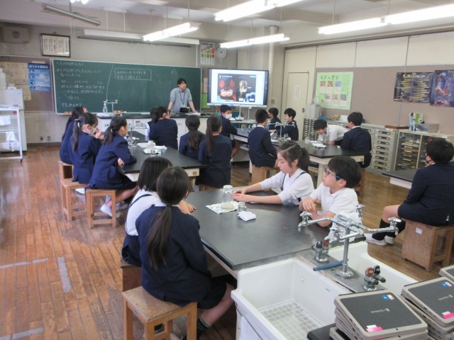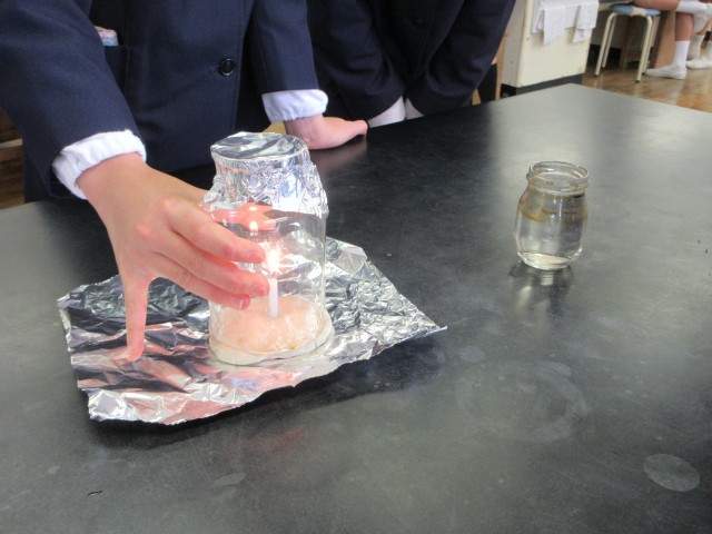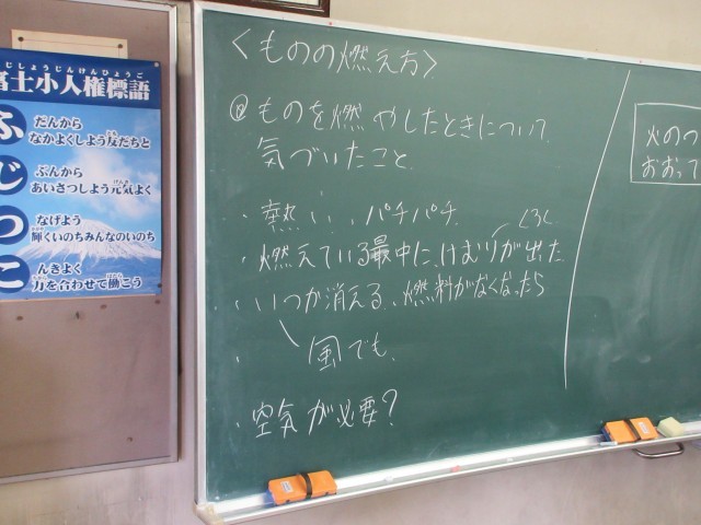 はじめに今まで物を燃やした体験をもとに話し合いました。一番の体験は去年の霧ヶ峰でのキャンプファイヤーです。どんな様子だったのか、燃えるってどんなことなのかを思い出しながら考えていました。そしていよいよ実験です。ろうそくに火をつけて、ふたをした集気びんをかぶせました。そうすると、・・・。結果をみんなで話し合って、これからどんなことを確かめていくか学習課題を作りました。