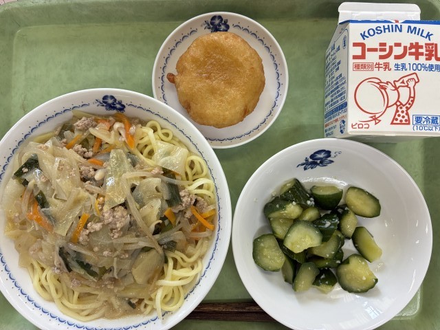 献立:牛乳、みそラーメン、きゅうり変わり漬け、いももち