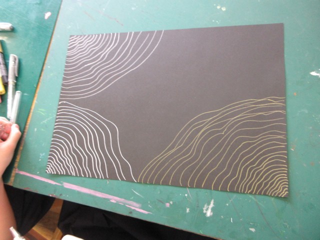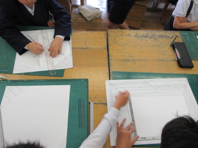 5年生、初めての図工は『線』を意識して絵を描くことです。曲線を重ねたり、定規で直線を引いて絵にしていったり、それぞれの思いを絵に表していました。みんな集中しすぎて疲れたと言いながら、夢中になって取り組んでいました。たった2時間でなかなかすてきな絵が仕上がりました。