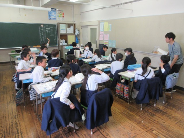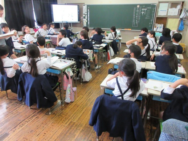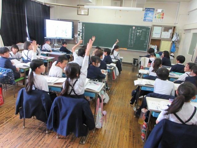 『話を聞く』というのはなかなか難しいです。4年生では、話す人の方を向いて話を聞くことができるように指導しています。先生が笑顔で楽しく話しながら教室の前だけでなく、窓側、廊下側と移動します。子供たちは体の向きを変えて先生の話を目で聞きます。相手と目を合わせて聞くことを新学期のはじめに指導しています。