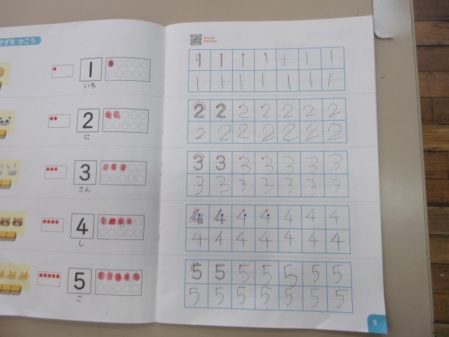 今日の算数は『数字をかく』です。教科書のお手本をなぞりながら、正しい数字の書き方を練習しています。みんな夢中になって練習していました。