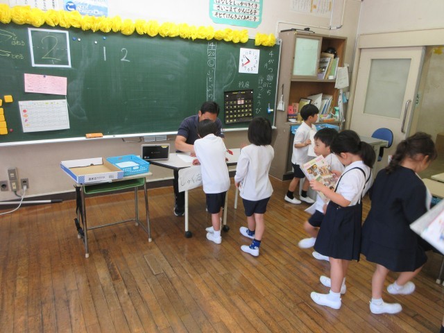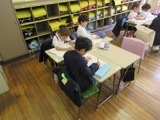 書き終わったら先生に見てもらいます。丸をもらったり、直すところを書いてもらったりしていました。少しずつ、小学校らしい学習が始まっています。