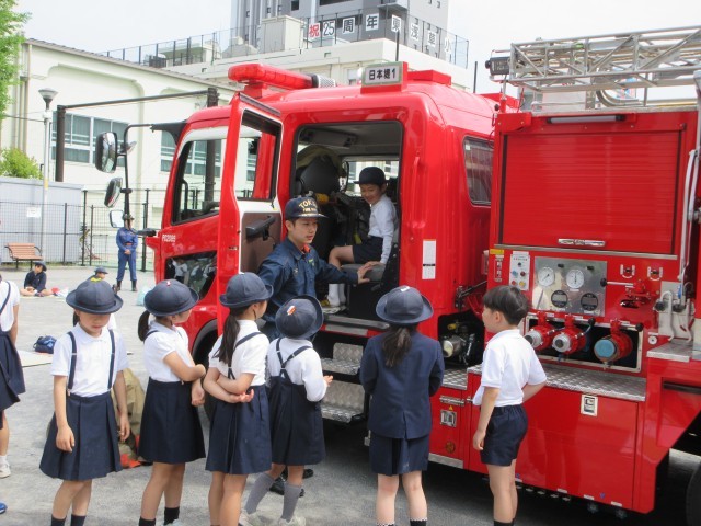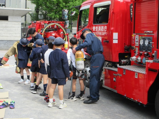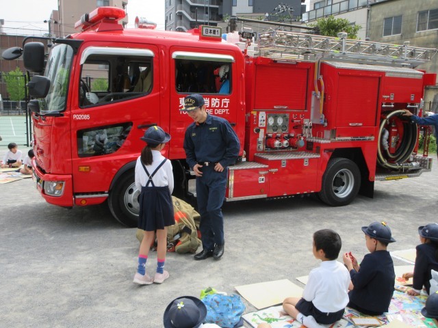 子供たちは消防車を通して、消防への思いを絵に表しています。描いている途中で消防士さんが防火服を着せてくれたり、重い酸素ボンベを背負わせてくれたり、質問に答えてくれたり、消防車に乗せてくれたりしました。そのふれ合いから子供たちは消防に携わる人の優しさや、強さ、頼もしさを感じて、それを消防車に表していました。たくさん触れ合ってくださった消防士さんに感謝です。1時間あまりでしたが、とてもいい学びになりました。
