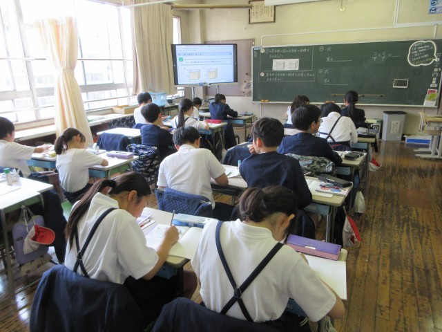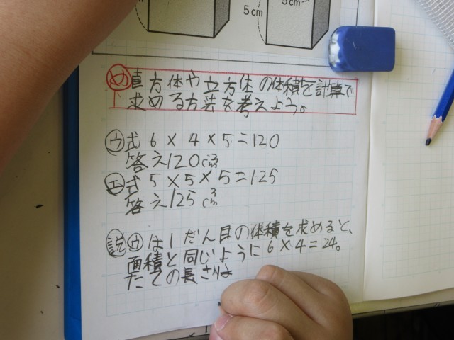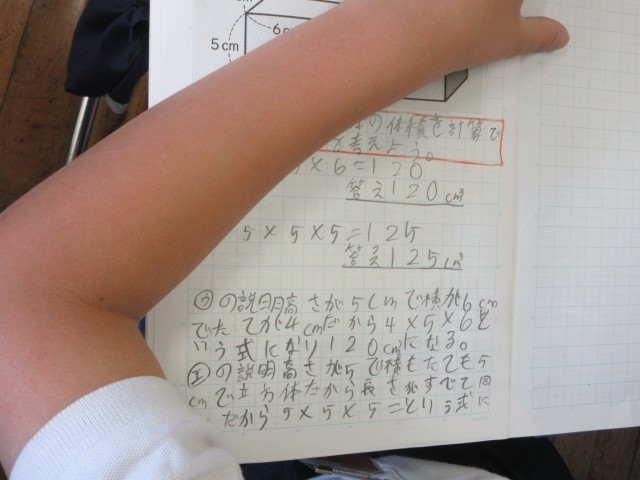 算数では体積の学習に取り組んでいます。今日は立方体と直方体の体積を求める課題です。先生からの指示は、『自分の考えとその理由を書くこと』です。解き方も様々ですが、理由を伝えながら考えを交流していきます。ただ問題を解けるだけでなく、自分の考えをもち、理由を付けて説明できる子を育てていきます。