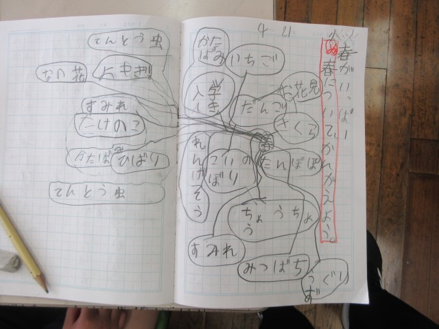国語の時間に『春について考えよう。』という学習をしました。春についてのイメージをふくらませるために、ウェビングという思考ツールを使いました。2枚目の写真のように『春』という言葉からイメージする言葉をどんどん繋いでいきます。ノートいっぱいに春から想像できる事柄を考え付くことができました。学校ではウェビングのように子供の考えを広げたり、逆に大事な事柄を絞って考えたりするための思考ツールを様々な場面で使っています。