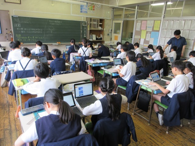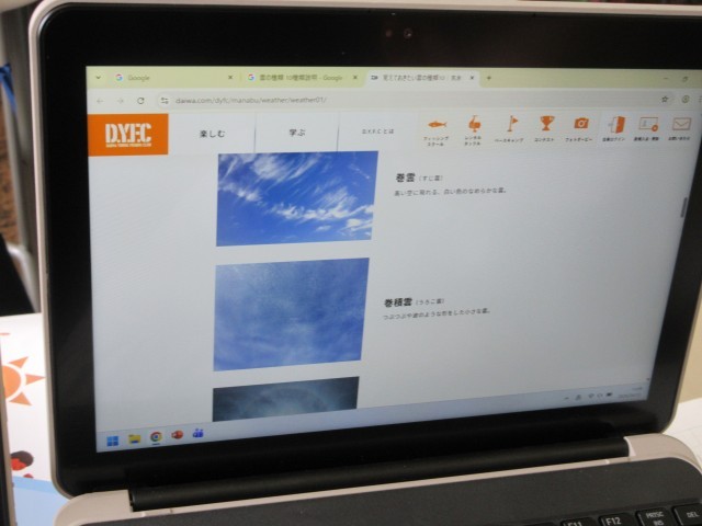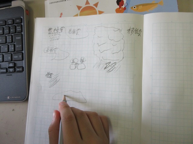 理科では天気の変化について学習しています。天気には雲が大きく関わっているということで、タブレットを使って雲の種類を調べました。主な雲だけで10種類あり、雨や雪を降らせる雲とそうでない雲とがあります。それぞれが調べて、絵や文で雲の種類を表していました。窓際に座っている子は窓の外を眺めながら、あれは『羊ぐもだ』と話していました。空を見上げてどんな雲なのか、これから天気はどうなるのかを調べていってほしいです。