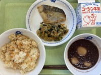 今日の給食は、里芋いりかやくご飯 ハタハタの南蛮づけ 和風サラダ くだもの 牛乳です。