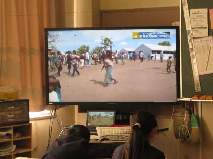 SDG`sについて考える学習では、毎時間各目標について調べ、考えています。今日は『目標2 飢餓をゼロに』です。ビデオを見たりしながら、世界の課題について考えていました