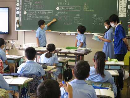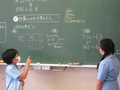 小数の割り算では、位をそろえるのが難しいです。今まで学習したことを使って、様々な方法で工夫して計算しました。発表の場面では、黒板や電子黒板を使って自分の考えをしっかりと伝えています。聞いている児童は、自分とは違う解き方を理解し、どの方法が一番良いかなどを考えています。発表した後には大きな拍手が起きました。