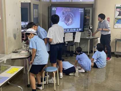 5年生が学習しているメダカの卵を廊下のモニターに映しています。理科専科の先生が、顕微鏡と専用のビデオカメラを接続し、大型モニターで見られるようにしました。5年生はプリントにその様子を記録しています。他の学年の子もたくさん集まって興味をもって見ています。目もしっかりとできていて、心臓の鼓動する様子、血管を血液が流れる様子も見られて、みんな大興奮です。卵から出てくるのをみんな楽しみにしています。理科室前には、理科室に紛れ込んできたスズメバチの標本なども置いてあり、小さな博物館になってきました。