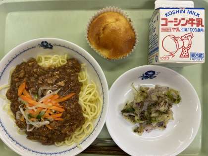 献立:牛乳、ジャージャー麺、野菜のゆかり和え、ヨーグルトポムポム