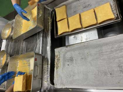 食パンにたまごや牛乳、バター、さとうをまぜたものをたっぷりひたしてオーブンで焼いています。