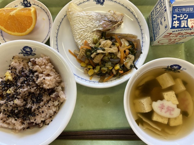 献立:牛乳、お赤飯、鯛のかま焼き、千草和え、わかたけ汁