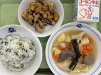献立:牛乳、昆布ご飯、魚のもみじ焼き、切り干し大根の煮物、いもいも汁 11月24...