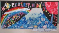 2年生は富士小学校の創立125周年、富士幼稚園の創立75周年を祝って、玄関の壁面...