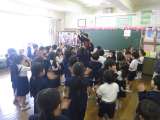 1年生、3クラスが一緒になって手遊びで楽しんでいると、2年生の代表児童3名がやっ...